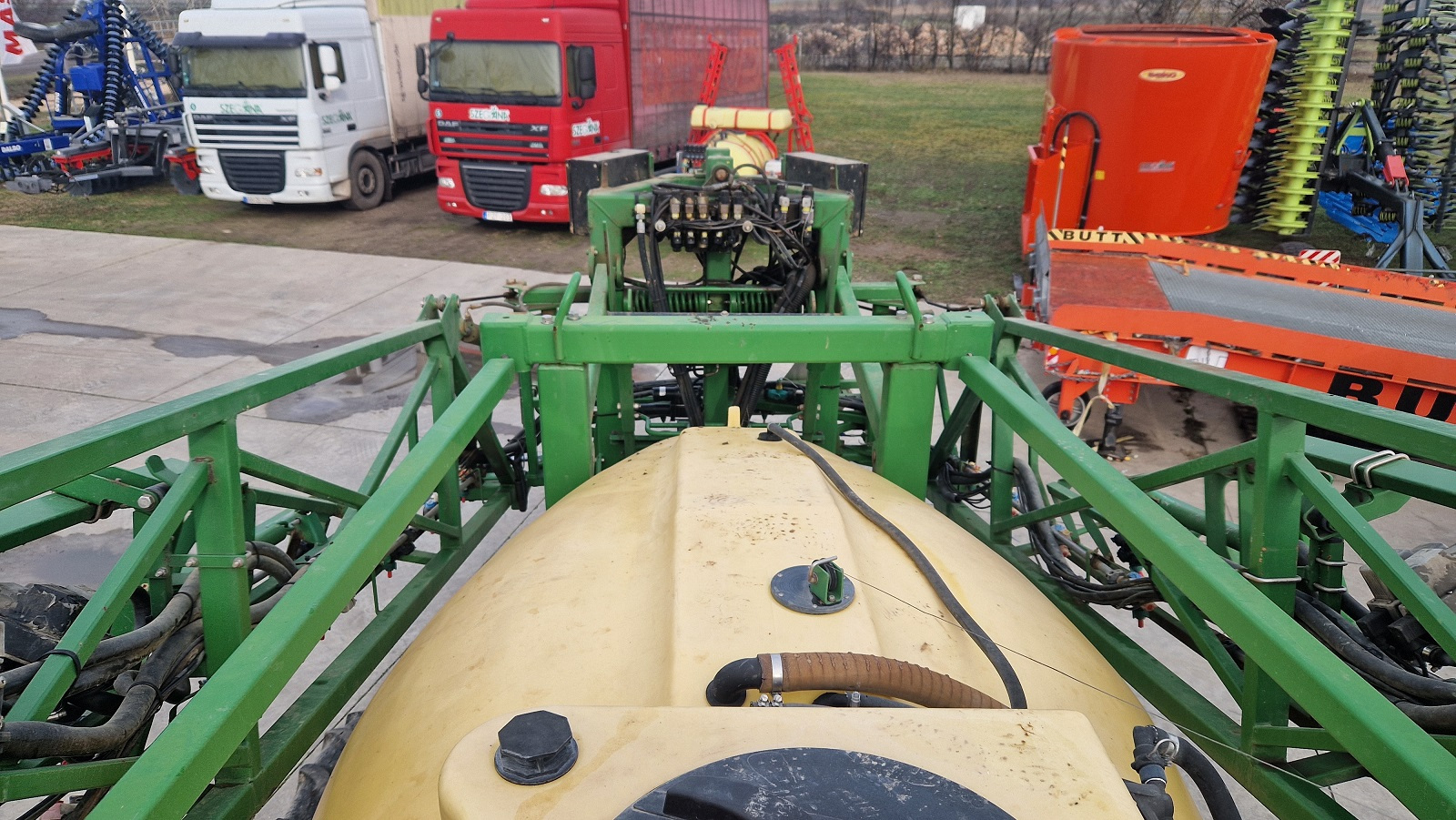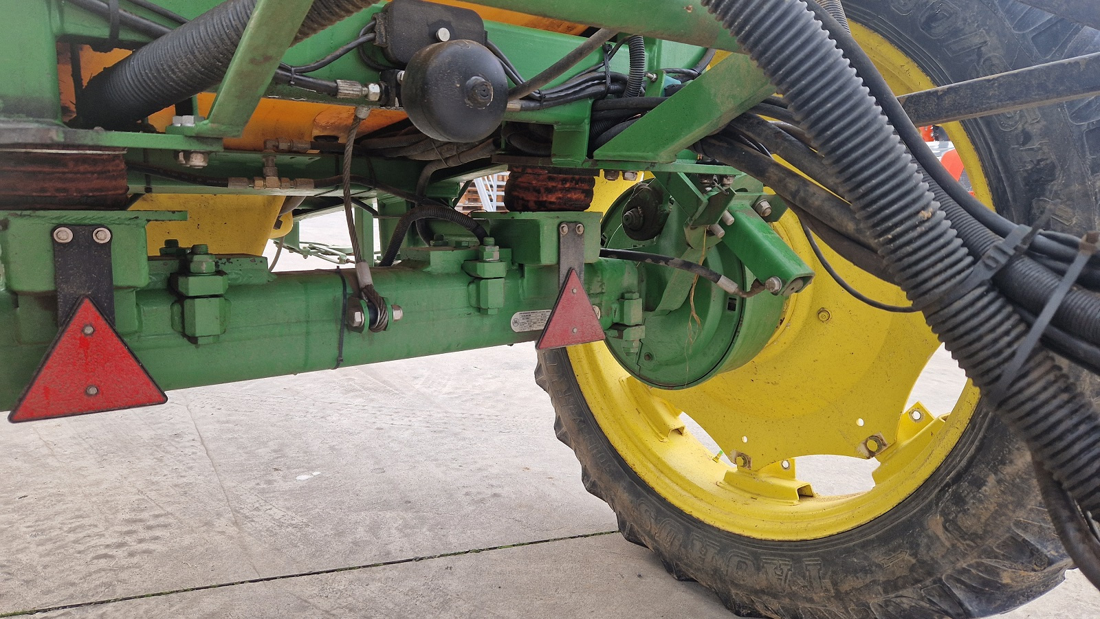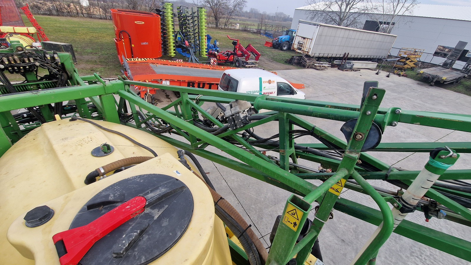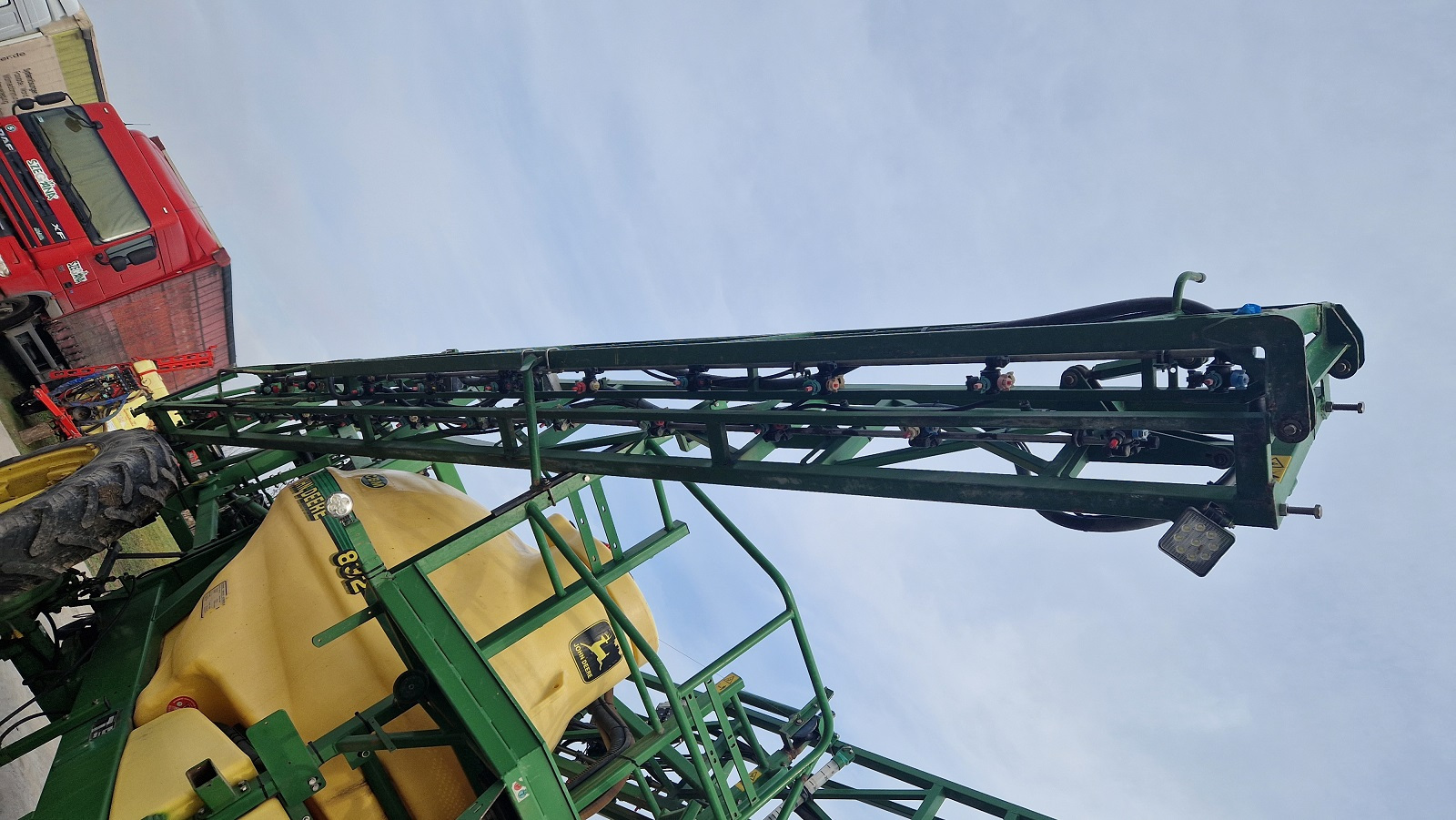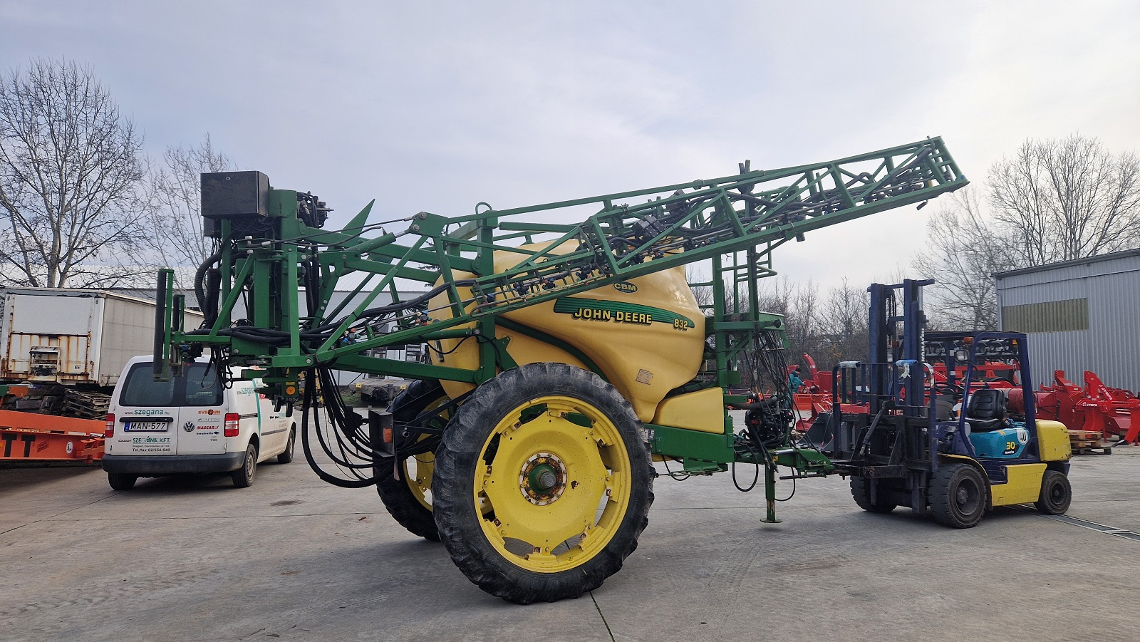 John Deere 832 vontatott szántóföldi permetező, 3.200 literes tartály, 24 m munkaszélesség, 5-ös fúvókatartó, 8 elektromos szakasz, számítógépes szabályzás, teljesen hidraulikus keretmozgatás, nyitás, billentés, oldalankénti emelés, paralelogramma keretfelfüggesztés, hidraulikus nyomkövető vonórúd, 280 liter/perc szivattyú teljesítmény, légfék, száraz tartályszintjelző, vegyszerbekeverő flakonmosóval, szép állapot.